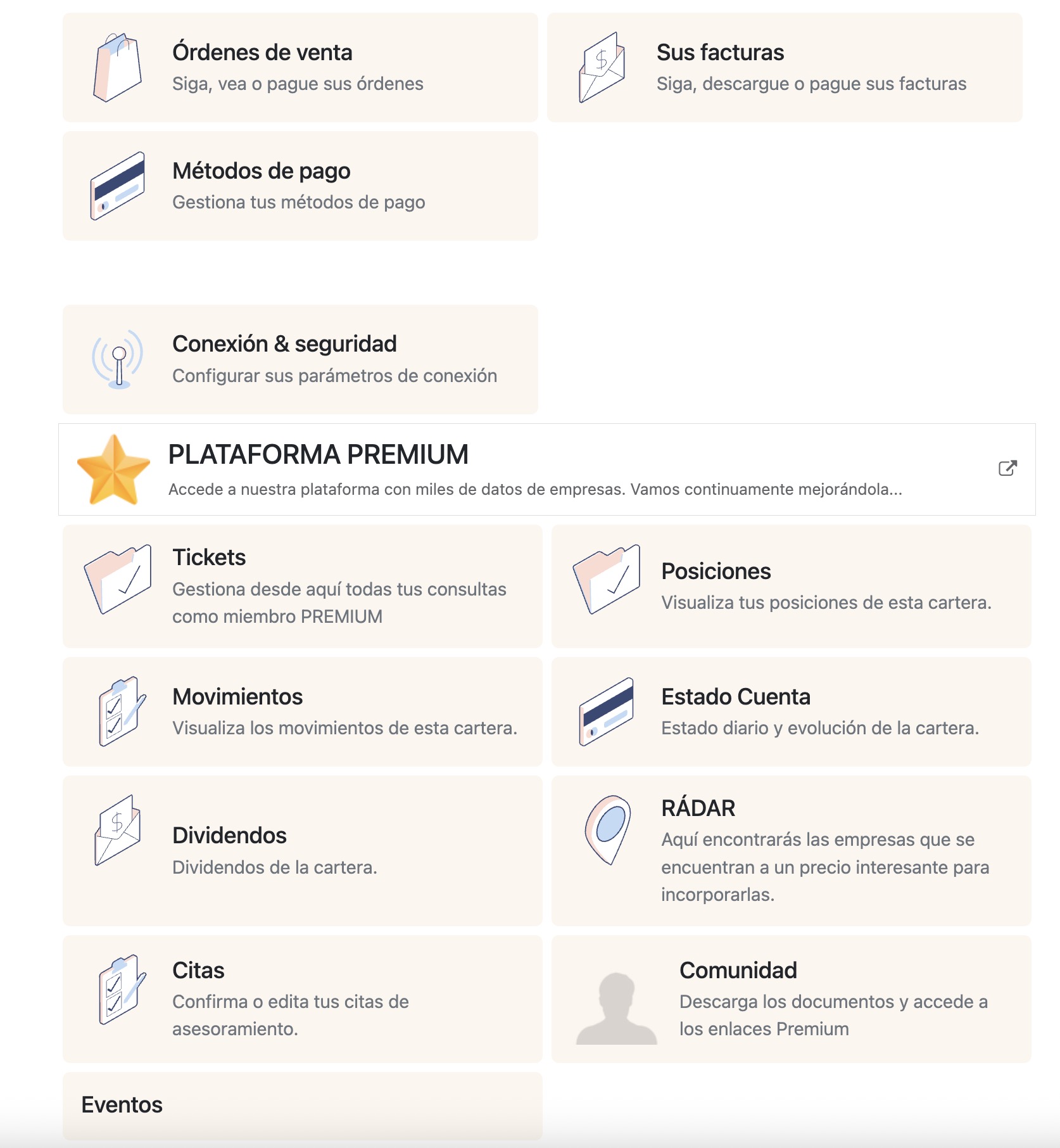 Si ya has entrado a tu cuenta desde Identificate (arriba en la web) verás que aparece tu nombre. Si entras dentro podrás ver las distintas opciones, donde puedes ver las herramientas como la Plataforma Premium, el radar, los Tickets y además (si has introducido tu cartera en la plataforma) tus posiciones, movimientos, dividendos, etc... Aquí te muestro una captura de cómo tienes que verlo todo al entrar a tu cuenta, si no es así por favor escríbeme un privado y lo solucionamos.