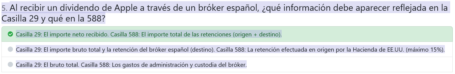 Por otra parte la pregunta 5 no entiendo que la a sea la correcta ya que para mi lo que habría que poner es bruto - retención españa no neto paso pantallazo. Quieres decir que al poner las 2 casillas retención bruta- retención destino (Es) es igual al importe neto.